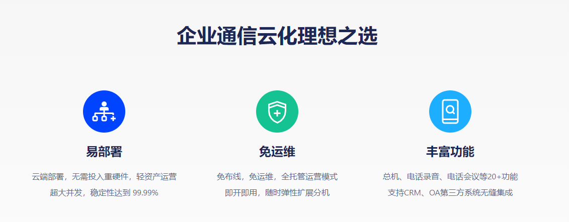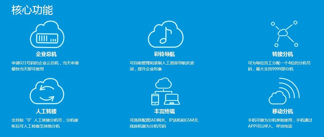 企业云总机CloudPBX,部署固话于云端,具备传统电话交换机/IPPBX的全部功能,免布线,免安装传统硬件PBX,即开即用按需扩展,低成本快速上线,支持全国多点分布式接入,为用户提供高可用、大容量、免运维、可弹性扩展的企业电话服务,是新一代企业办公、客服、营销、隐号服务首选。