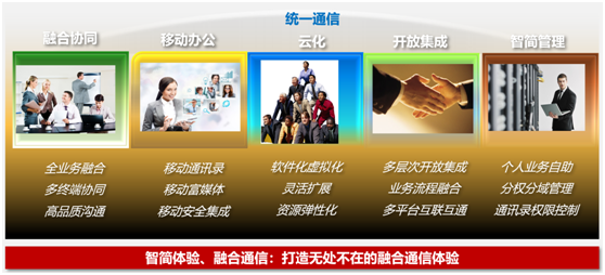 是指把计算机技术与传统通信技术融为一体的新通信模式,作为一种解决方案和应用,统一通信系统将语音、传真、电子邮件、移动短消息、多媒体和数据等所有信息类型合为一体,从而为人们带来选择的自由和效率的提升,是以人为本的应用层面的融合与协同,是更高一个层次的理念,新一代通信与IT产业。